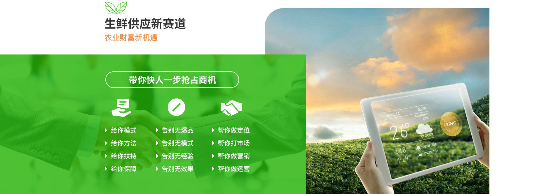 打通(tōng)城(chéng)市(shì)到(dào)農(nóng)村(cūn)的(de)食材接口将新鮮農(nóng)産品及時(shí)送到(dào)客戶的(de)餐桌上(sh àng)